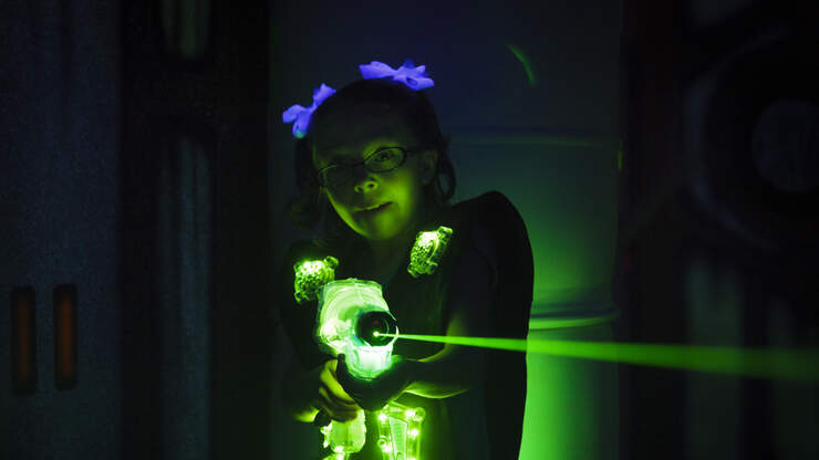 Our multi level arenas have swirling fog energetic music and fun waiting around every corner.